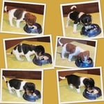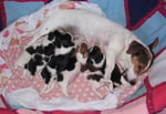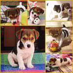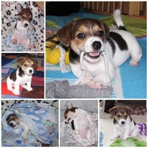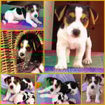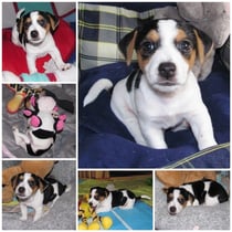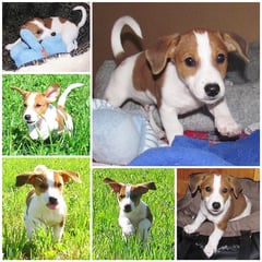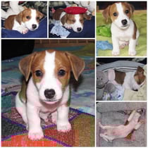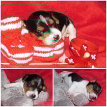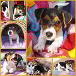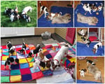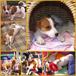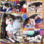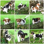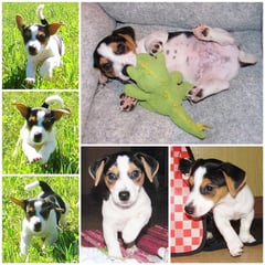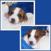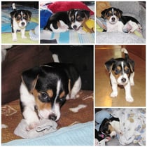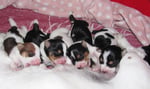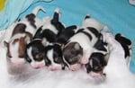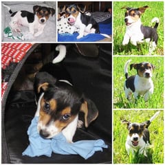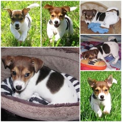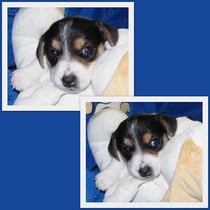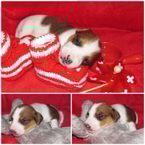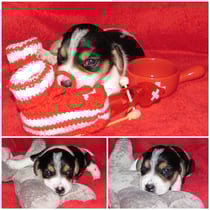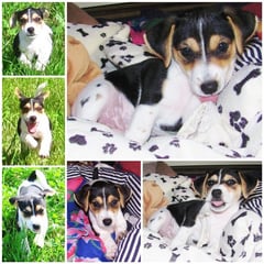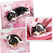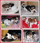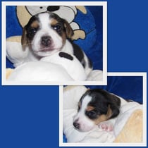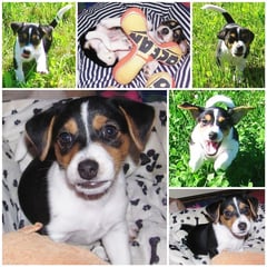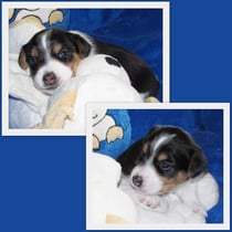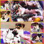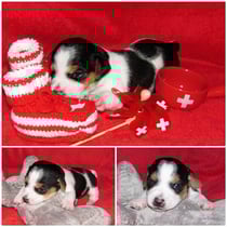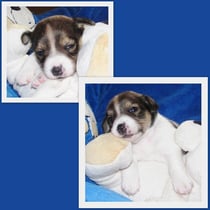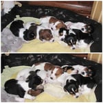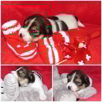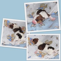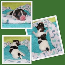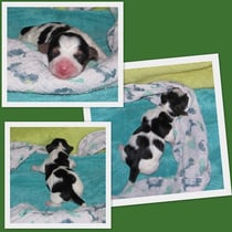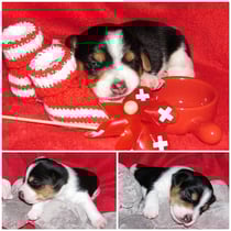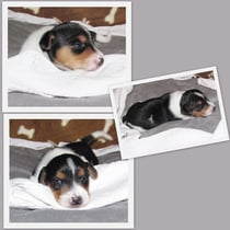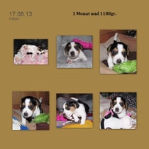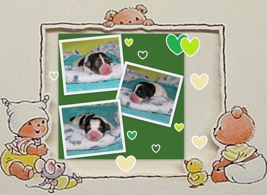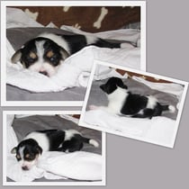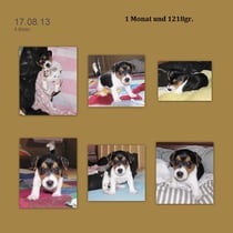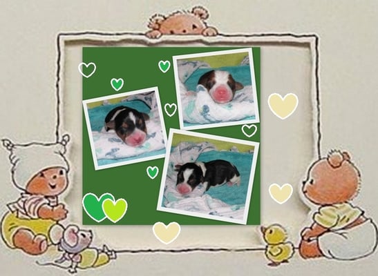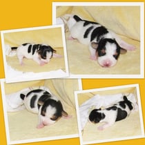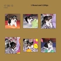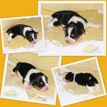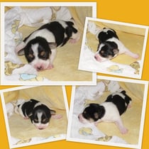 5. Welpe Junge Tricolor, geboren um 10.50 Uhr, Gewicht 245gr. Fotos links von 18.15 Uhr. Mitte vom 19.07.13, 2 Tage jung, Gewicht 303gr. Rechte Collage vom 22.07.13 5 Tg u. 404gr.