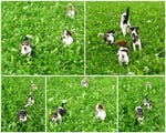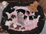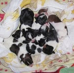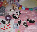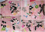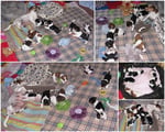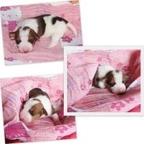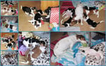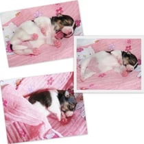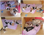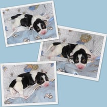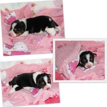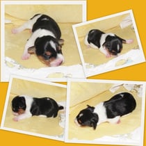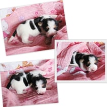 2. Welpe Mädchen Tricolor, geboren um 10.00 Uhr, Gewicht 268gr. Fotos li von 18.15 Uhr. Mitte vom 19.07.13, 2 Tage jung, Gew. 333gr. Rechte Collage vom 22.07.13 5 Tage und 425gr.