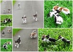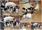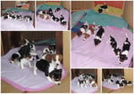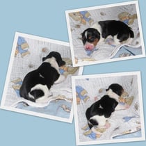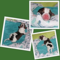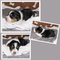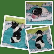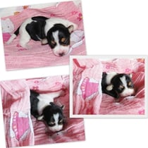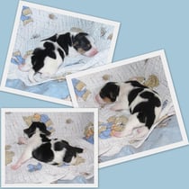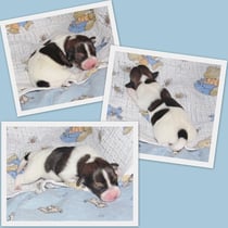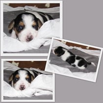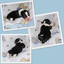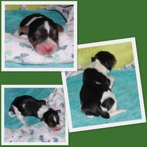 3. Welpe Junge Tricolor, geboren um 10.05 Uhr, Gewicht 228gr. Fotos li von 18.15 Uhr. Mitte vom 19.07.13, 2 Tage jung, Gew. 280gr. Rechte Collage vom 22.07.13 5 Tage und 377gr.