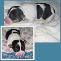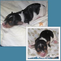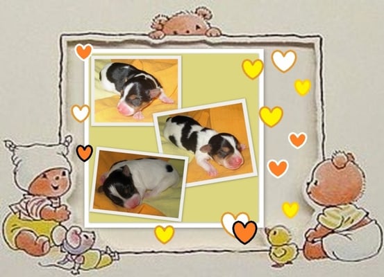 1. Welpe Junge Tricolor, geboren um 00.30 Uhr, Gewicht 212 gr. Fotos li von 12.30 Uhr.