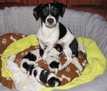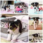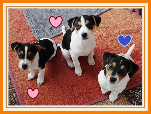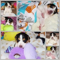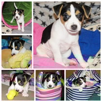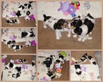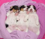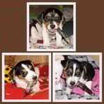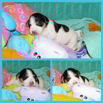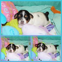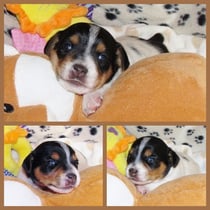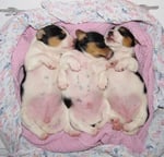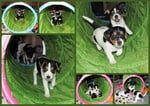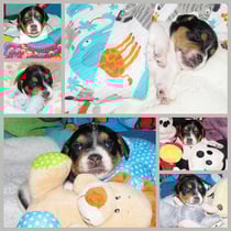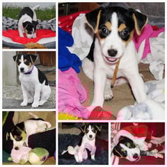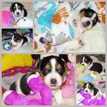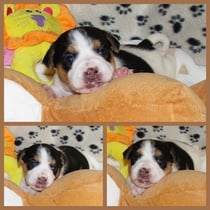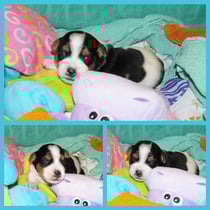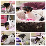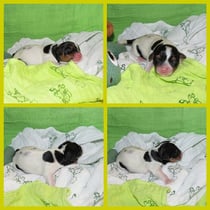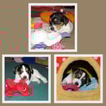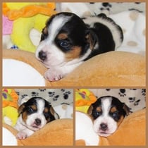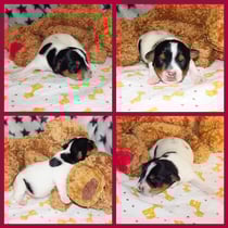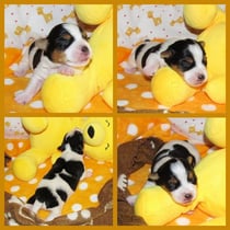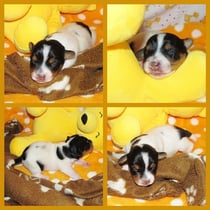 4. Welpe Mädchen Tricolor, geboren um 07.05 Uhr, Gew. 160 gr. Fotos li von 17.45 Uhr. Mitte vom 13.10.19, 2 Tage jung, Gewicht 235gr. Re Collage vom 16.10.19 5 Tage und 344 gr.
