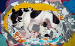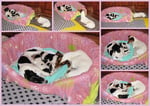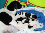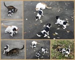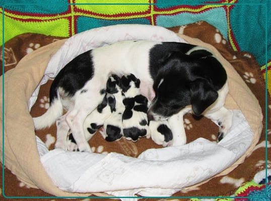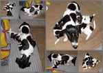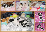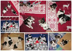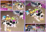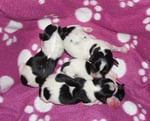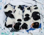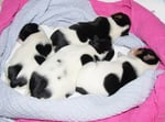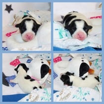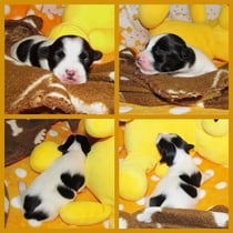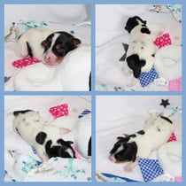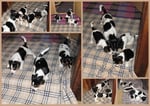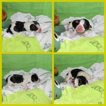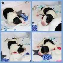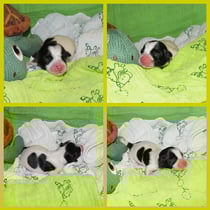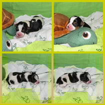 1. Welpe Mädchen Weiss-Schwarz, geb. um 04.47 Uhr, Gew. 144 gr. Fotos li von 17.45 Uhr. Mitte vom 13.10.19, 2 Tage jung, Gewicht 181gr. Re Collage vom 16.10.19 5 Tage und 233 gr.