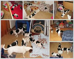 2. Welpe Junge Tricolor, geboren um 05.15 Uhr, Gewicht 185 gr. Fotos li von 17.45 Uhr. Mitte vom 13.10.19, 2 Tage jung, Gewicht 266gr. Re Collage vom 16.10.19 5 Tage und 373 gr.