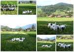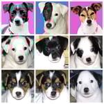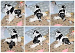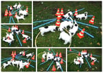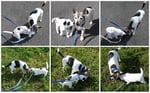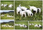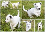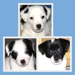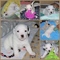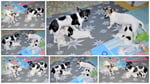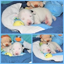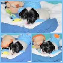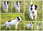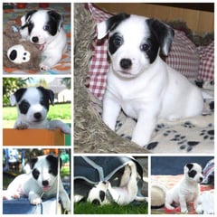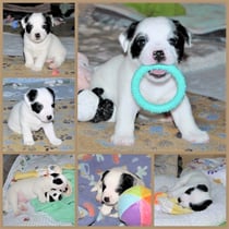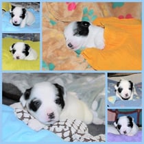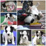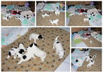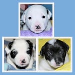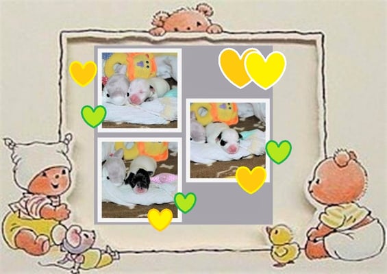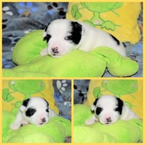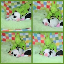 1. Welpe Junge weiss - schwarz, geb. um 21.42Uhr, Gew. 220gr. Fotos li von 12.40 Uhr. Mitte vom 13.08.23, 2 Tage jung, Gewicht 280 gr. Re Collage vom 16.08.23, 5 Tage u. 445 gr.