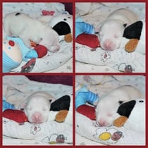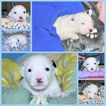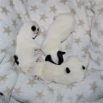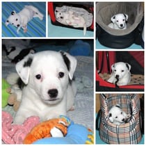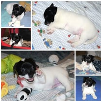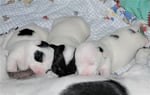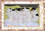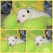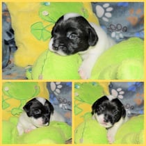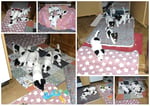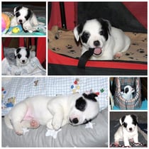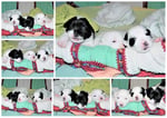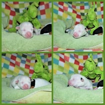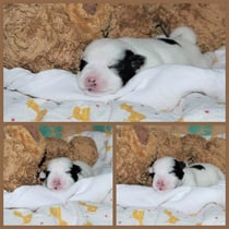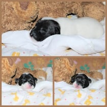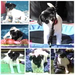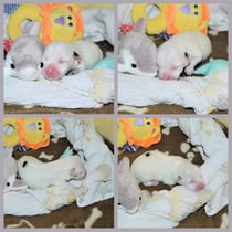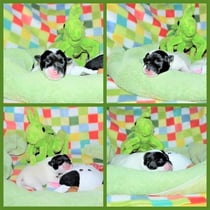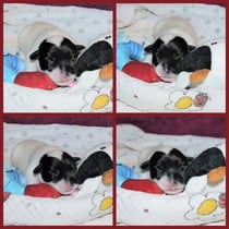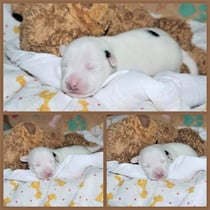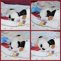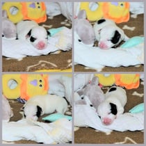 3. Welpe Mädchen weiss - schwarz, geb. um 21.47Uhr, Gew. 215gr. Fotos li von 12.40 Uhr. Mitte vom 13.08.23, 2 Tage jung, Gewicht 275 gr. Re Collage vom 16.08.23, 5 Tage u. 433 gr.